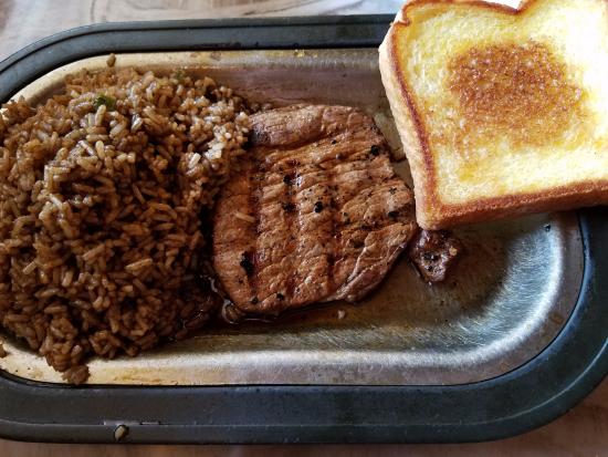 Tonight, I didn’t fix dinner, and we did not go out. Instead I went to one of our favorite places (Sarges Shack) and brought home their famous rice and steak.